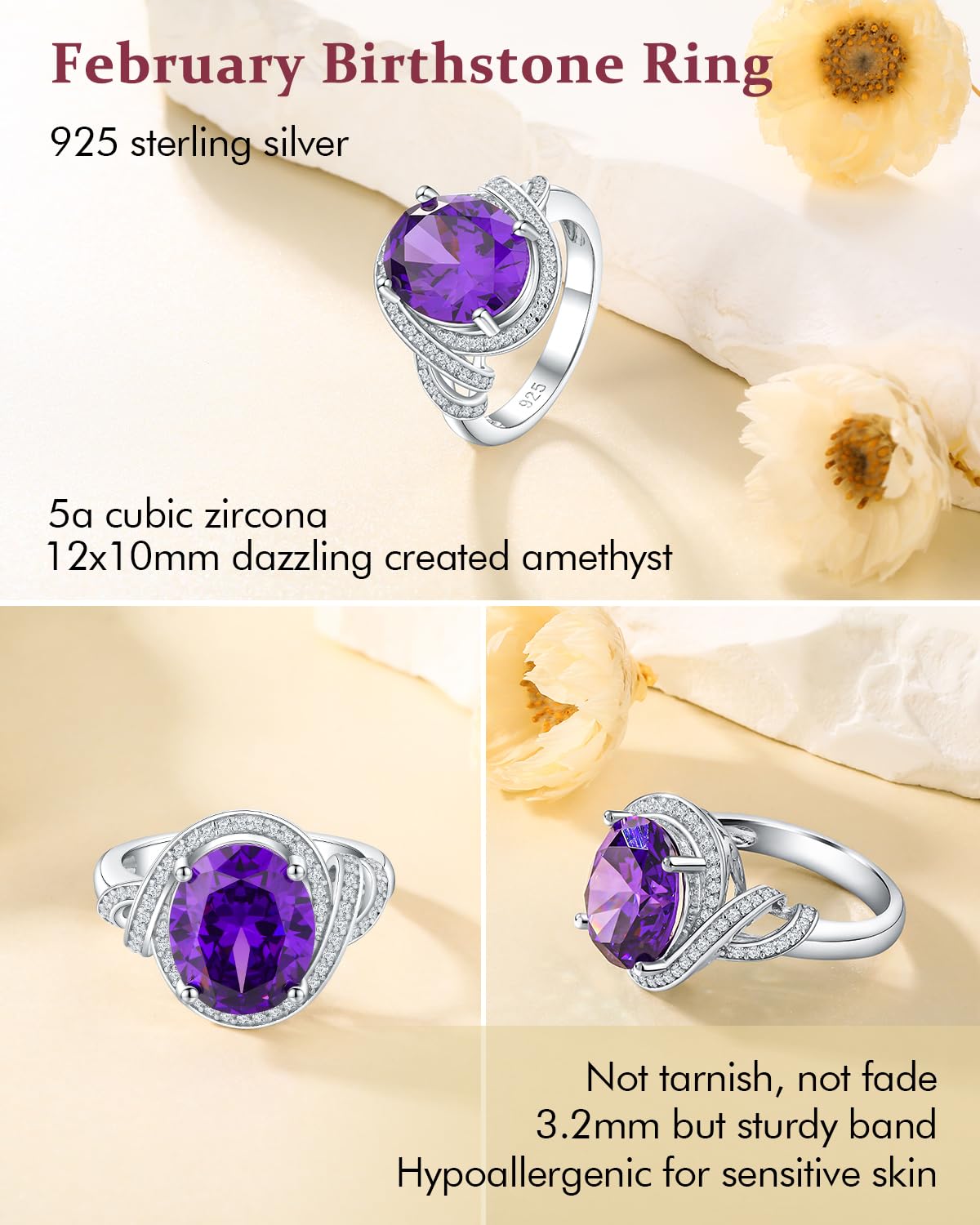 - Amethyst Rings for Women: This elegant dark purple stone ring features a hand-set 12×10 mm oval-cut lustrous created amethyst. The exquisite classic prong setting ensures maximum security for the stone, while small 5A cubic zirconia accents enhance its brilliance and sparkle