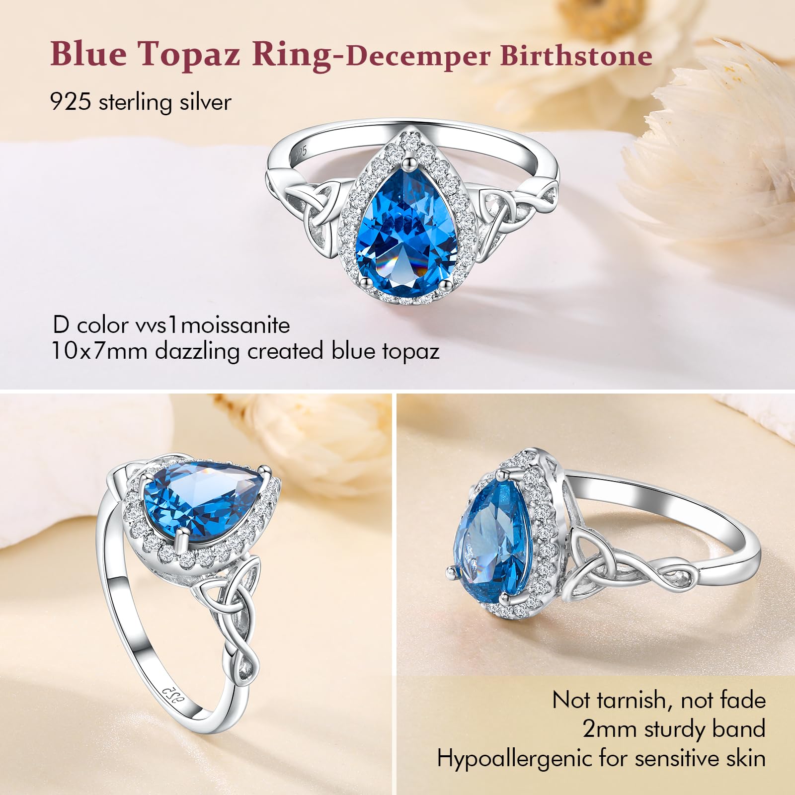 - Blue Topaz Rings for Women: This celtic knot pear ring are set by hand with a brilliant cut created blue topaz in the center and the D color VVS1 moissanites halo setting enhances the overall beauty and size of the center stone, creating a dazzling and luxurious look