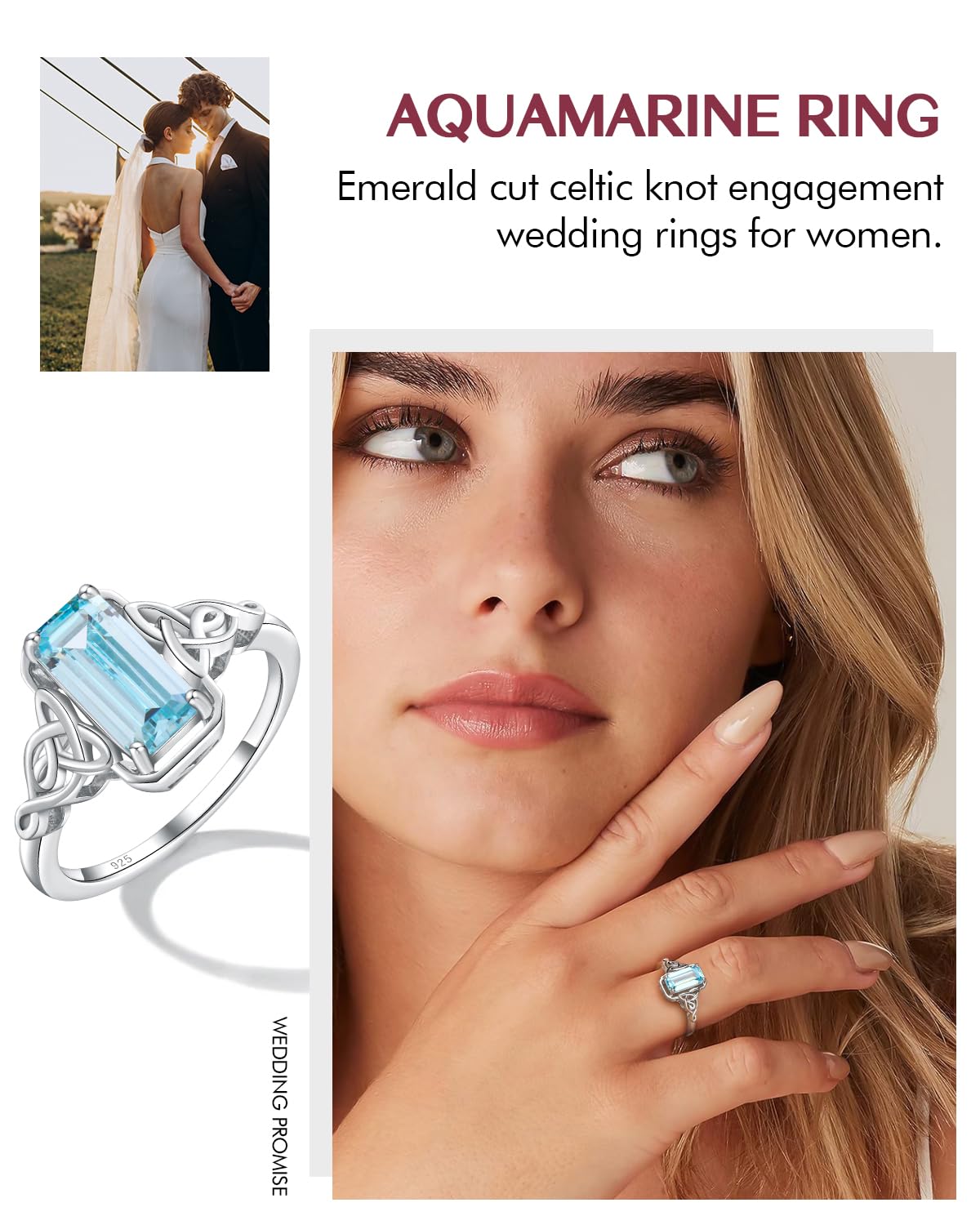 - Aquamarine Rings for Women: This light blue stone celtic ring is set by hand with 10*5mm emerald cut lustrous created aquamarine, its exquisite classic prong setting ensures maximum security for the stone while enhancing their brilliance and sparkle