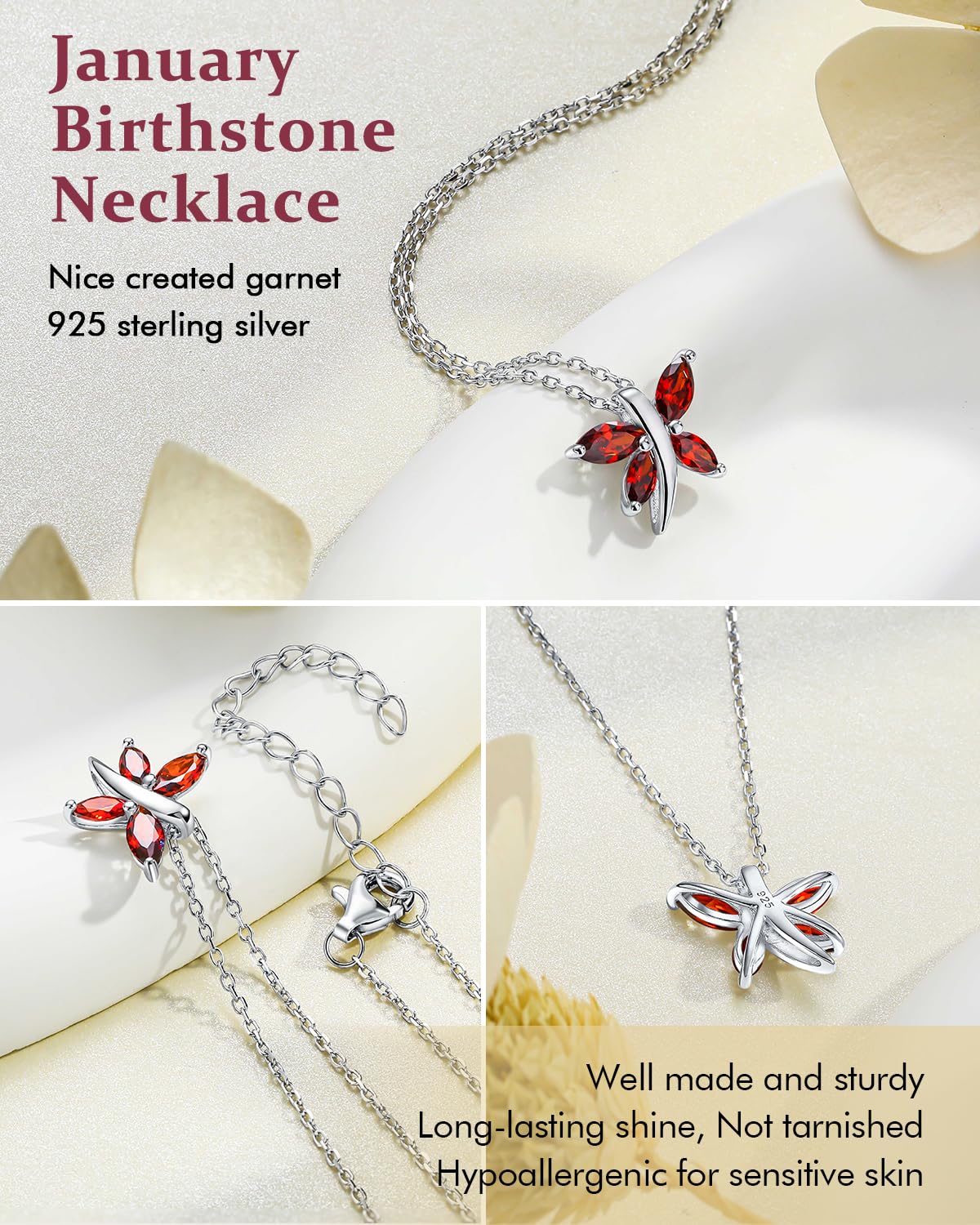 - Dragonfly Necklaces for Women: The dragonfly, a timeless symbol of transformation, adaptability, and grace. This dainty dragonfly pendant necklace decorated with deep red garnet birthstone, celebrates January birthdays while offering a touch of everyday elegance