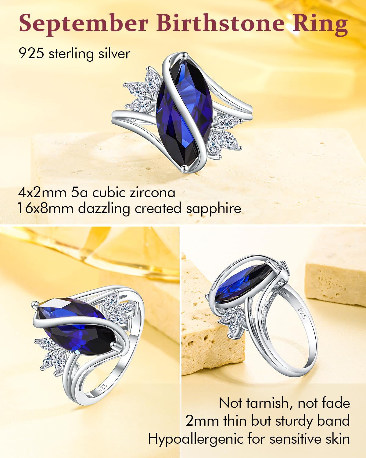 - Sapphire Rings for Women: This elegant dark blue stone ring features a hand-set 16×8mm marquise-cut lustrous created sapphire. The exquisite classic prong setting ensures maximum security for the stone, while small 5A cubic zirconia accents enhance its brilliance and sparkle