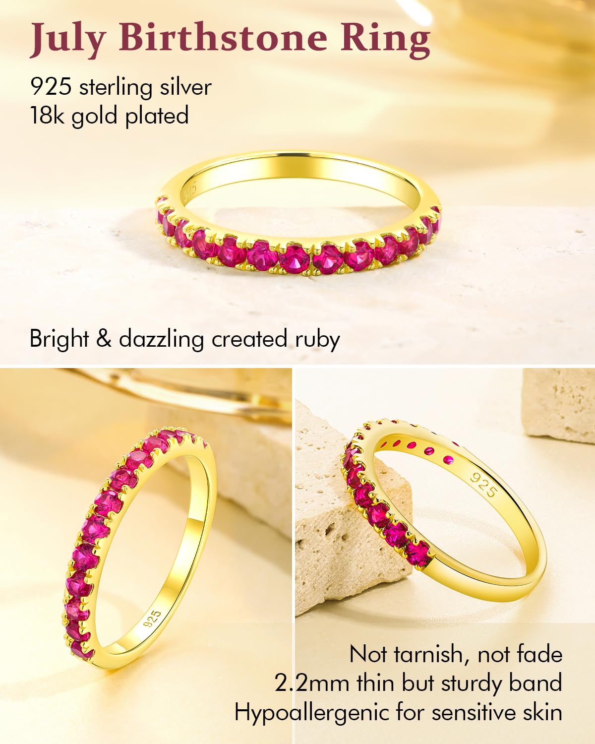 - Gold Plated Rings: Expertly crafted from premium 925 sterling silver, this classic ruby band ring features a high-polish finish with durable that resists tarnishing and scratching. Lead- and nickel-free, it is hypoallergenic for sensitive skin. The delicate 2.2mm band provides a sleek, comfortable fit, perfect for everyday wear